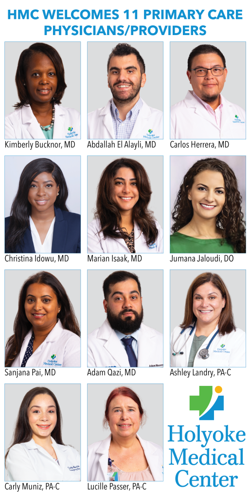 Holyoke Medical Center is proud to welcome Kimberly Bucknor, MD; Abdallah El Alayli, MD; Carlos Herrera, MD; Marian Isaak, MD; Christina Idowu, MD; Jumana Jaloudi, DO; Sanjana Pai, MD; Adam Qazi, MD; Ashley Landry, PA-C; Carly Muniz, PA-C; and Lucille Passer, PA-C.